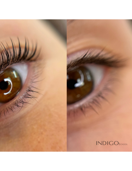 Formulée à base de cystéamine, elle nourrit, hydrate et renforce la fibre du cil tout en lui offrant une courbure naturelle. Parfaite pour les cils fins ou fragilisés, elle procure un résultat durable de 6 à 8 semaines et agit comme un véritable traitement réparateur. La formation inclut également la teinture hybride pour intensifier la couleur et vous apprendre à adapter le soin à chaque type de cil et morphologie d’œil.